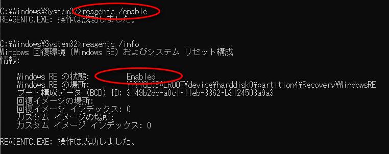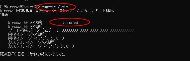 コマンドは、「reagentc /info」・・・「Enabled」有効になってますね。