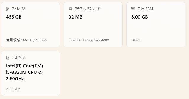 ご覧の通り、i5-3320M 第三世代のCPU、Windows11非対応ですが・・・・