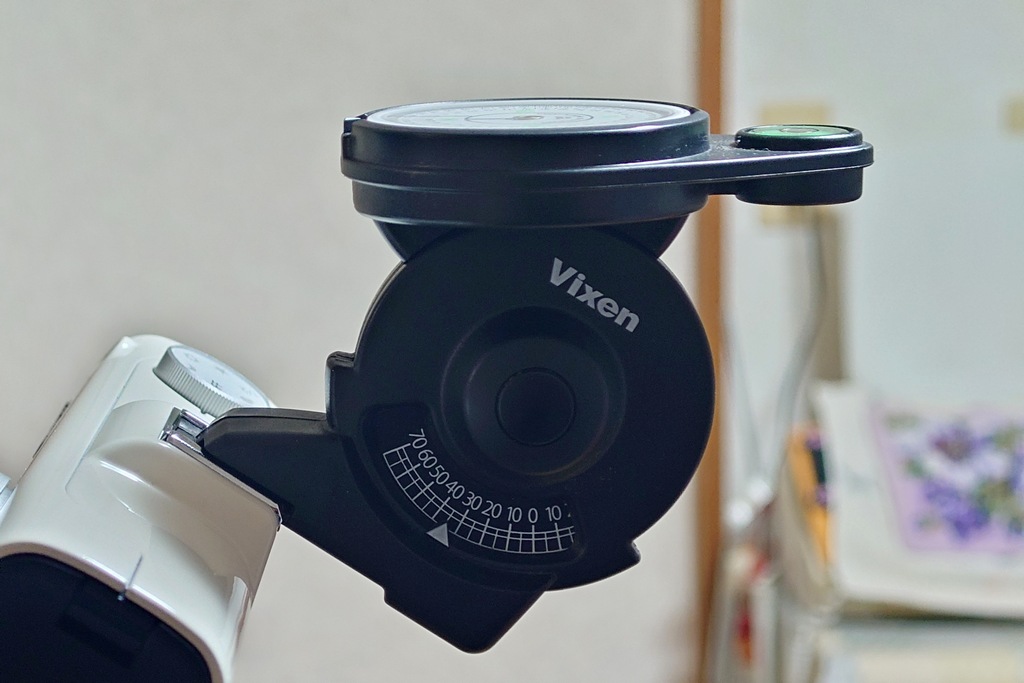 赤道儀本体にも、仰角調整用のゲージが付いてます。