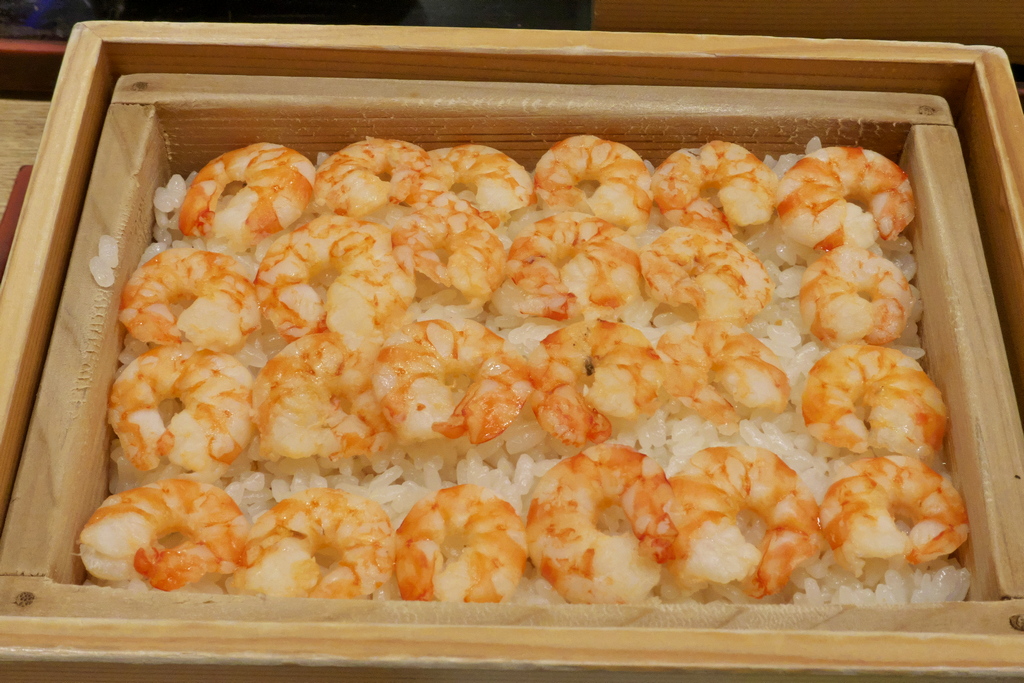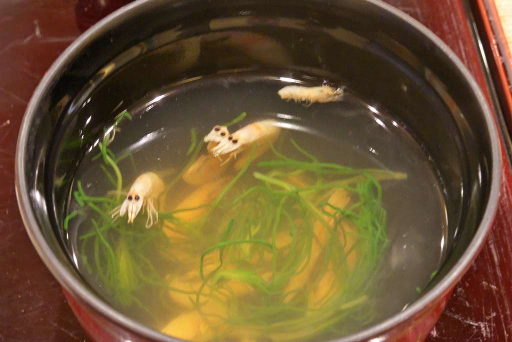 お吸い物にも、エビ・・・・なんとなく、見られてる感じがします。