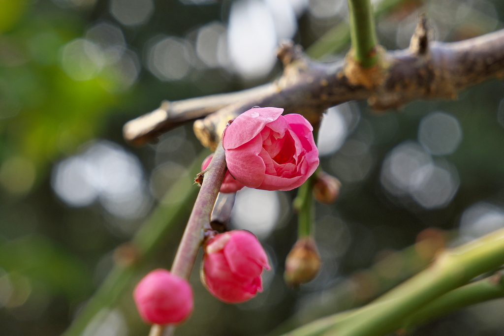 そして、やっと開花し始めた、枝垂れ梅。