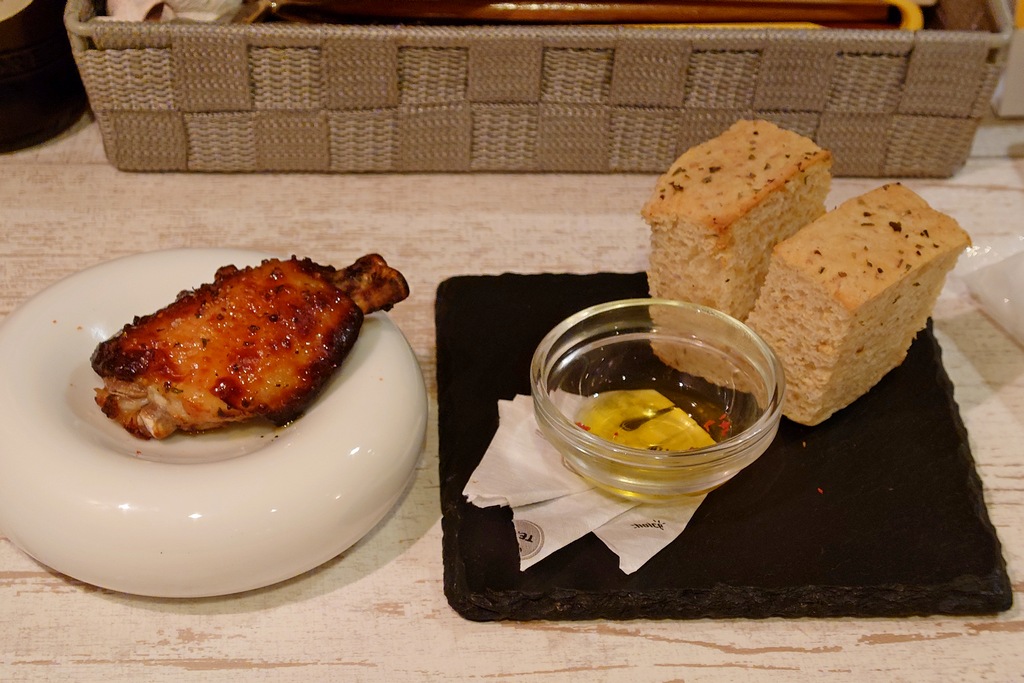 フォカッチャと、お通しの手羽元。